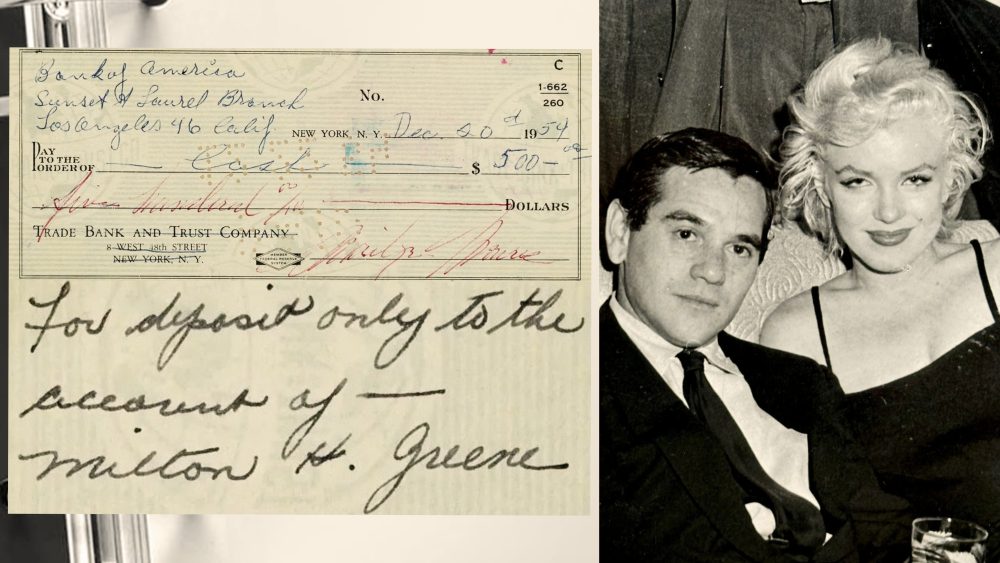 A $500 cheque issued by a New York bank and signed by Marilyn on December 20, 1954, although the address her home bank in Los Angeles has been added by hand. A handwritten annotation on the verso indicates that the cheque was endorsed by Milton Greene. Marilyn was staying at the photographer’s home in Westport, Connecticut, and they were soon to co-found an independent company, Marilyn Monroe Productions.