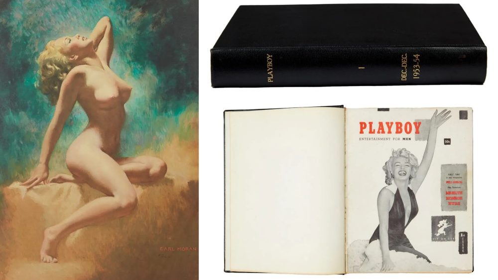 At left, a framed 1970 print entitled ‘Lady of the Light,’ signed by artist Earl Moran. Marilyn posed semi-nude for reference photos which inspired Moran’s illustrations during the 1940s. And at right, an original copy of Playboy‘s first issue, published in December 1953 with Marilyn on the cover, from a private collection including nearly every issue of the men’s magazine.