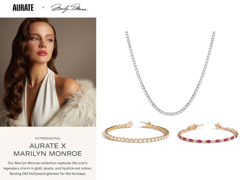 Aurate New York – a female-founded, sustainable jewellery company, specialising in lab-grown diamonds and recycled gold – has partnered with Authentic Brands Group (the majority owner of Marilyn’s estate) on a Monroe-themed capsule collection.