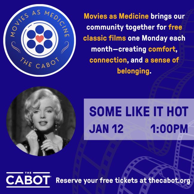 Some Like It Hot is showing at The Cabot in the Greater Boston suburb of Beverly, Massachusetts, on Monday, January 12 at 1:00 pm. This screening is part of the monthly ‘Movies as Medicine’ series, and admission is free – but be sure to reserve a place, so you don’t miss out…