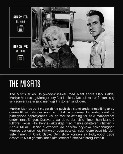 “The Misfits is a Hollywood classic, starring Clark Gable, Marilyn Monroe and Montgomery Clift. It’s not just the film itself that’s interesting, but also the story behind it … Nevertheless, this is a beautiful film, where all the stars show themselves from their very best side … Monroe gave one of her best performances in The Misfits. Unfortunately, this was the last film she was able to complete.”