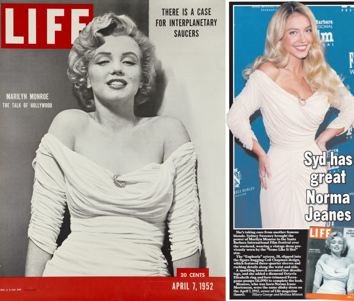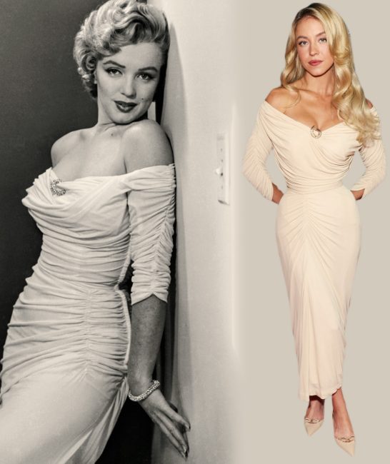 Actress Sydney Sweeney (Euphoria, The Housemaid) paid homage to one of Marilyn’s most iconic looks at the SBIFF Virtuoso Awards in Santa Barbara, California this week, wearing an ivory ruched silk cocktail dress recalling Marilyn’s photo shoot with Philippe Halsman for her first LIFE cover story in March 1952.