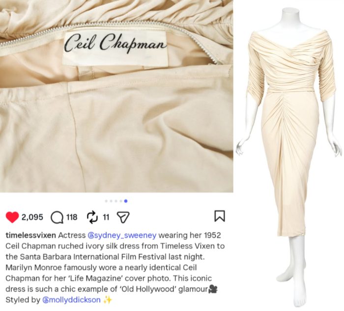 However, while several media outlets (including the New York Post) have stated that Sydney wore the original garment, it is in fact a ‘nearly identical’ dress by one of Marilyn’s favourite designers, Ceil Chapman, which celebrity stylist Molly Dickson sourced from Timeless Vixen, a vintage boutique in Beverly Hills.