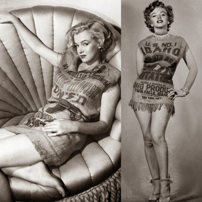 Although the article dates the shoot to 1951, Gene Kornman’s famous photos were shot in February 1952, after a journalist had criticised Marilyn’s gaudy attire at the Photoplay Awards. Therefore, this month marks the 74th anniversary of that shoot, and not the 75th as stated above. However, Marilyn first donned a potato sack for Earl Theisen back in 1951 – several months before her fashion faux-pas (see here.)