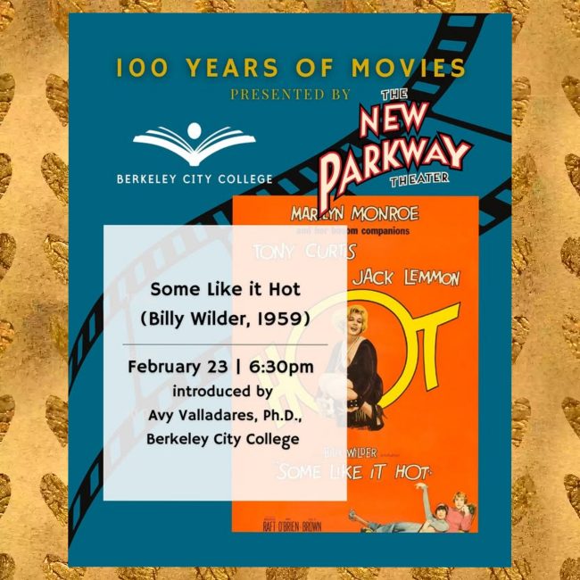 Some Like It Hot is showing at the New Parkway Theatre in Oakland, California on Monday, February 23, at 6:30 pm. This screening will be introduced by Avy Valladares, concluding the 100 Years of Movies series hosted by Berkeley City College.