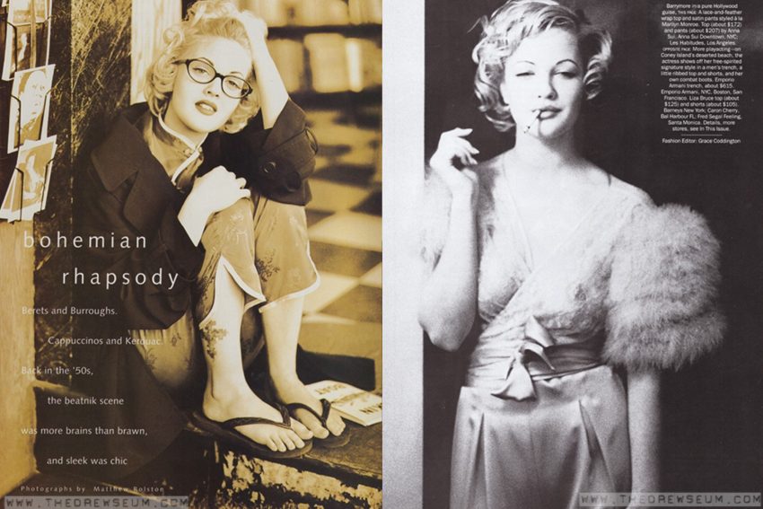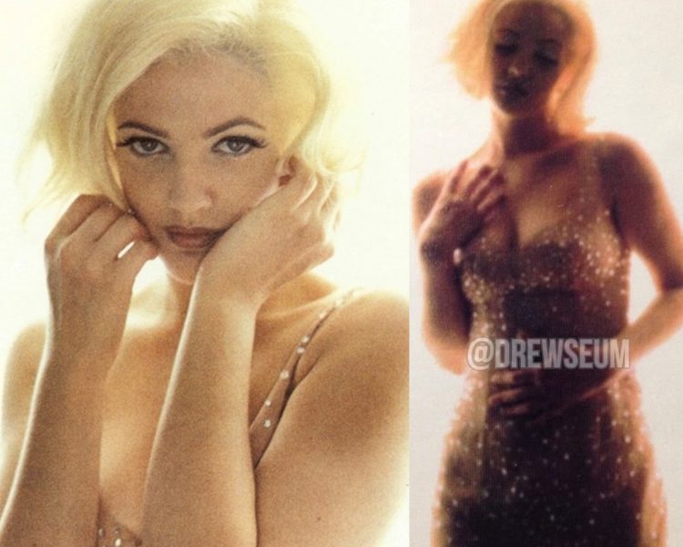 In 1993, Drew posed for photographers Matthew Rolston (Seventeen) and Ellen Von Unwerth (Vogue), evoking vintage Hollywood glamour with nods to Marilyn’s bombshell style.