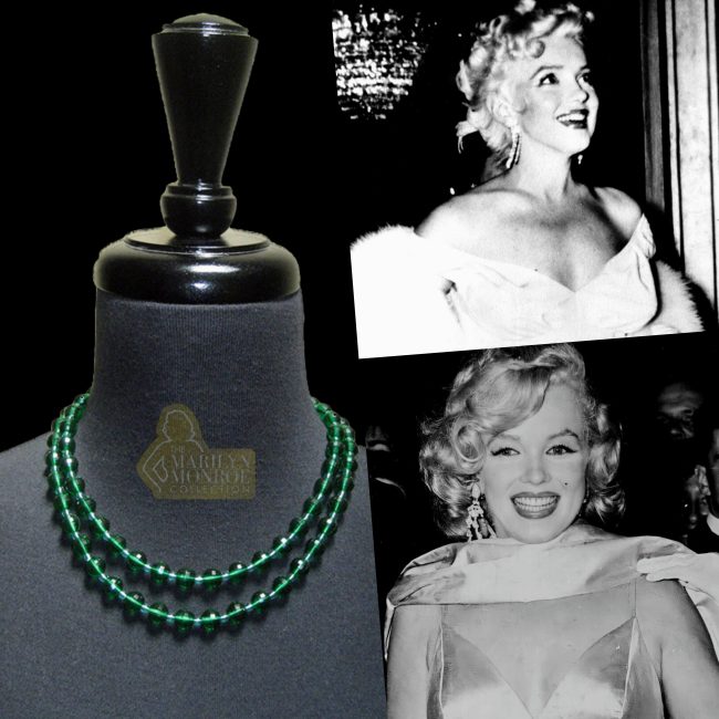 There is also a necklace she owned made of emerald-toned beads, 36 inches long with a gold-toned clasp. This necklace was also auctioned in 1999 at that landmark Christie’s sale, The Personal Property of Marilyn Monroe.