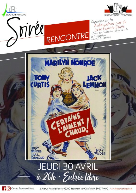 And on Thursday, April 30 at 8:30 pm, Some Like It Hot is showing at the Beaumont Palace in Beaumont-sur-Oise, Northern France. This free event – hosted by students from Évariste Galois High School – includes a discussion about the Marilyn Monroe: 100 Years exhibition in Paris, an hour’s drive away.