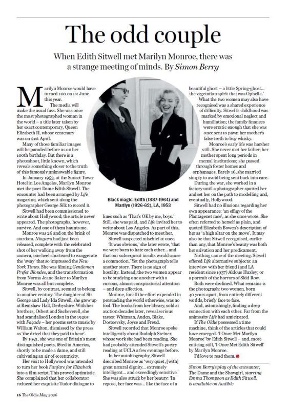 Marilyn previously graced The Oldie‘s cover in August 22, on the 60th anniversary of her death. And now as she reaches another milestone, playwright Simon Berry revisits Marilyn’s friendship with the English poet Edith Sitwell, which is also the subject of his radio play, The Dame and the Showgirl.