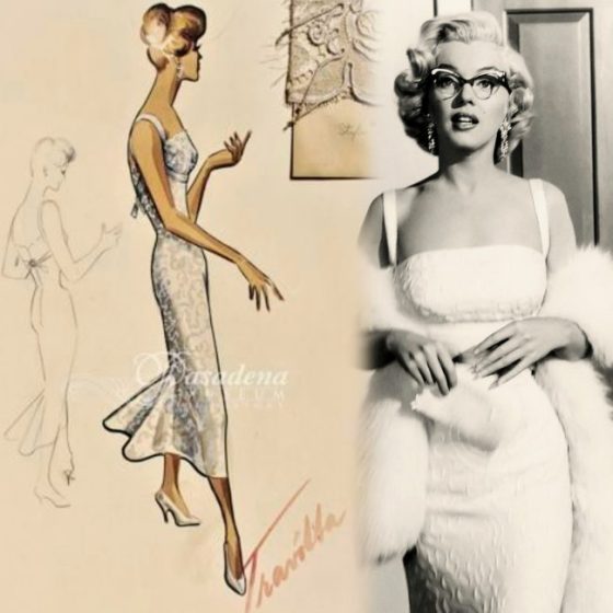 A rare Travilla sketch of Marilyn’s cream fitted gown with ribbon patterning – as seen in How to Marry a … More