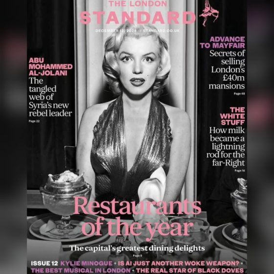 Marilyn graces the latest cover of The London Standard (dated December 12), illustrating a feature on the city’s best restaurants … More